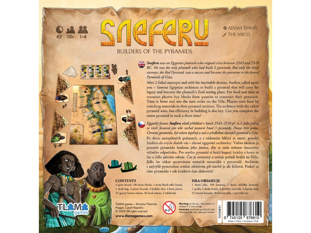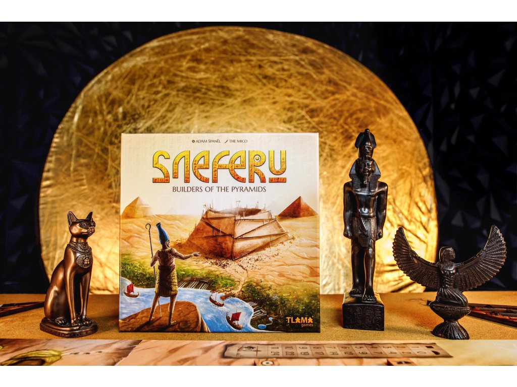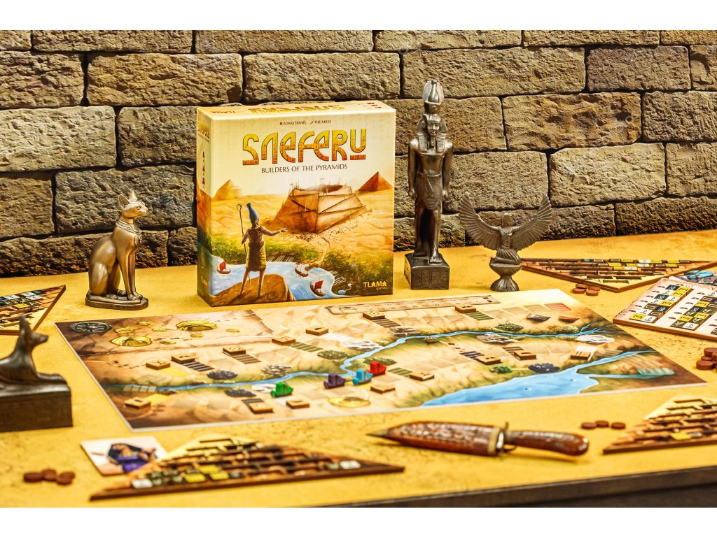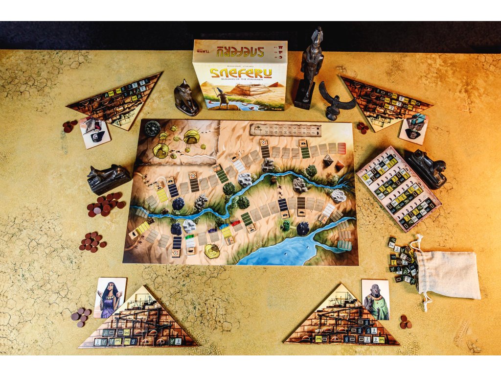Sneferu je rodinná abstraktní hra od Adama Španěla (Project L), ve které se hráči snaží získat přízeň velkého faraona tím, že z vytěžených bloků postaví co nejvyšší pyramidu (přičemž každý blok je kombinací dvou z pěti možných materiálů). Tyto bloky hráči získávají utrácením dvou zdrojů ve hře: jídla a času. Čas, který představuje vaše loď plující po Nilu tam a zpět, je omezený zdroj, jehož vyčerpáním pro hráče končí hra. Poloha lodí na řece také určuje pořadí hráčů: na tahu je vždy hráč, který spotřeboval nejméně času a je na Nilu nejvíce vzadu. Hráči mohou získávat jídlo tím, že dokončí části svých pyramid s odpovídajícími materiály, nebo překryjí bonus na pyramidě.