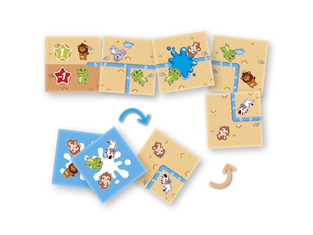 Každý hráč před sebou staví svoji vlastní řeku. Řeku stavíte tak, že berete karty z hromádky uprostřed stolu. Když si vezmete kartu z hromádky, otočte ji lícem (stranou s řekou) vzhůru a přiložte ji na konec své řeky. Na rubu každé karty jsou 3 zvířátka, ovšem na líci najdete jen 2 z nich. Musíte pečlivě volit karty, které si vezmete, ale zároveň je třeba postupovat rychle.