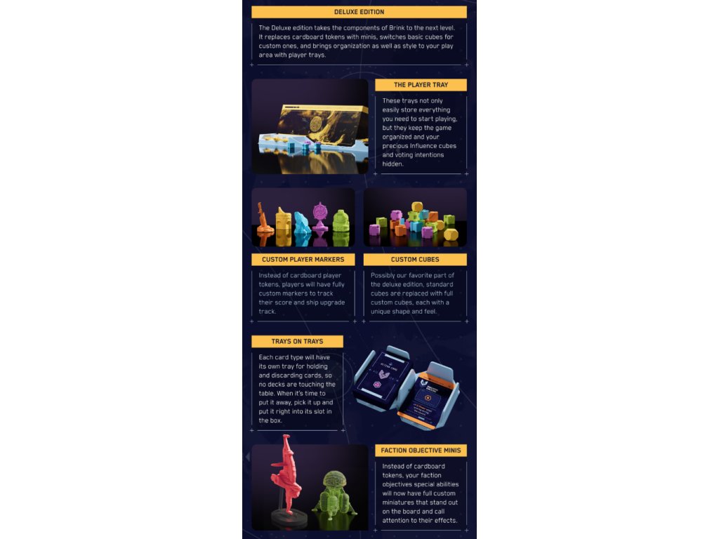 Brink je hra s umisťováním dělníků, obchodováním a skrytým hlasováním, která přináší svět Moonrakers do nového žánru. Kombinuje strategii a plánování typické pro worker placement hry s vyjednáváním a interakcí. Toto znáte z Moonrakers a Fractured Sky.