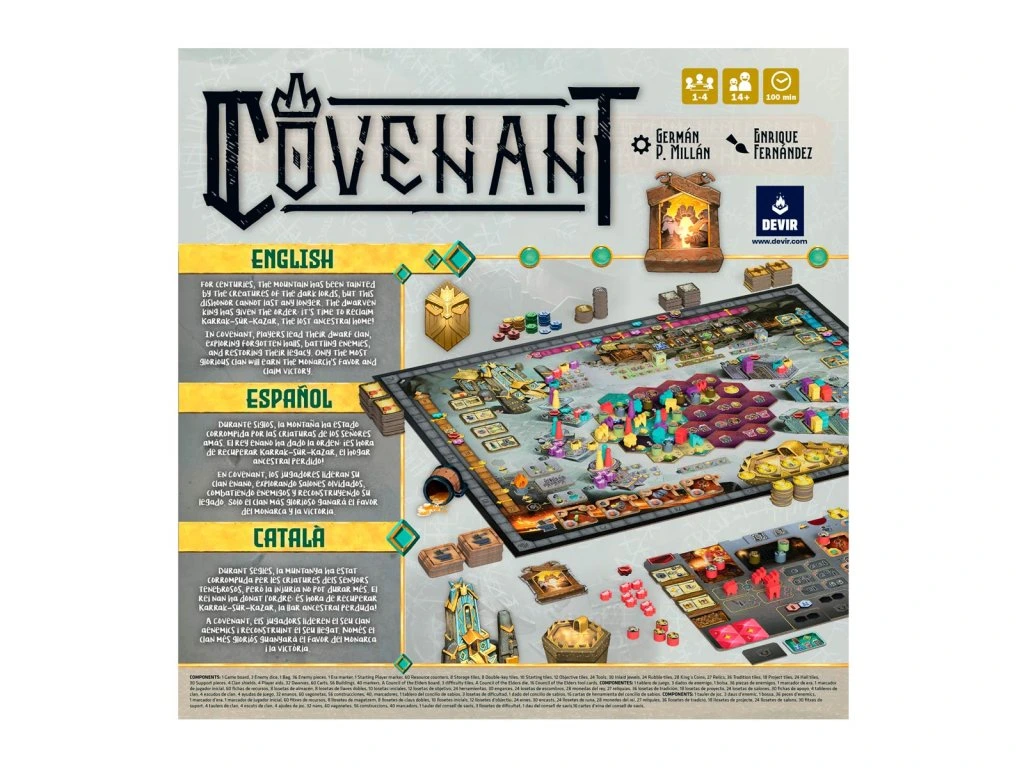 Hra Covenant, kterou navrhl Germán P. Millán (autor her Bitoku, Sabika a Men Nefer) a ilustroval Enrique Fernández, je určena pro jednoho nebo až čtyři hráče ve věku od 14 let a trvá přibližně 100 minut. V hře Covenant je každý hráč vůdcem trpasličího klanu, který přijal dohodu o znovuzískání rodového sídla trpaslíků. V průběhu tří kol, nazývaných éry, každý klan přispěje k rekonstrukci ztraceného města, které bylo před staletími dobito a zničeno temnými silami.
