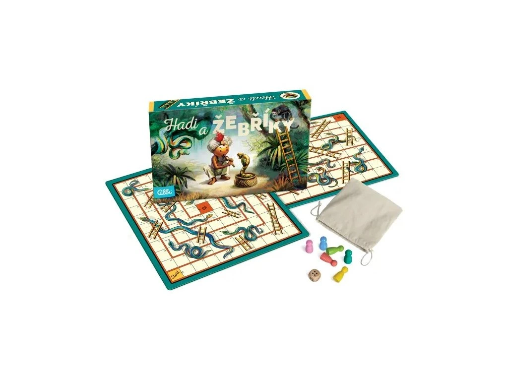 Hra Hadi a žebříky obsahuje: 1 oboustranný herní plán, 6 figurek, 1 hrací kostku, 1 plátěný pytlík, česká a slovenská pravidla.
