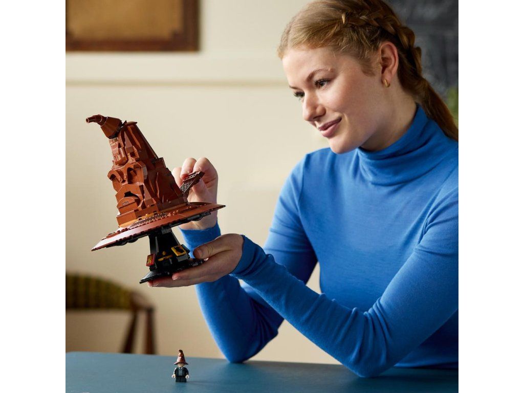 - Tip na dobrodružný filmový dárek pro dospělé – Vydejte se s do světa čar a kouzel s výstavním modelem LEGO® Harry Potter™ Mluvící Moudrý klobouk… který skutečně mluví