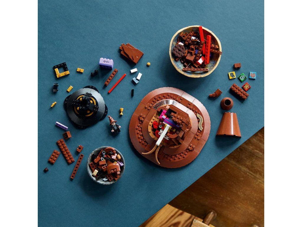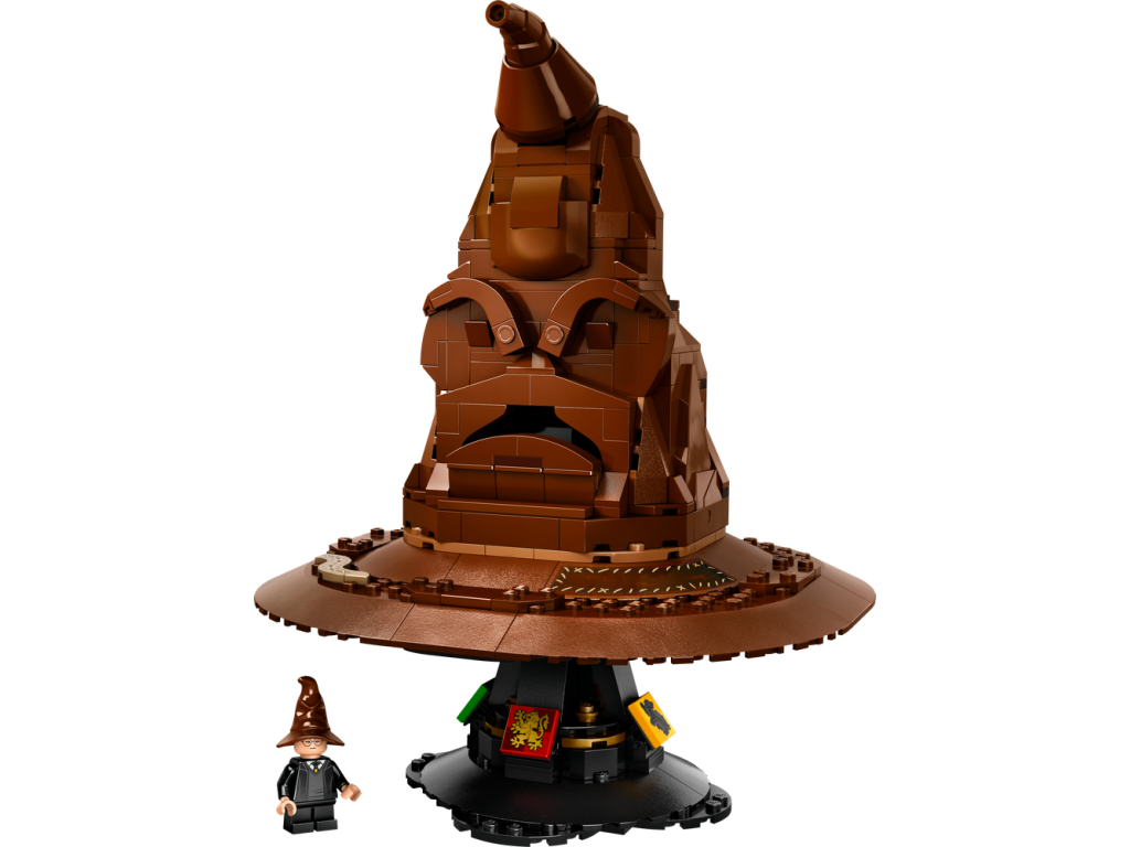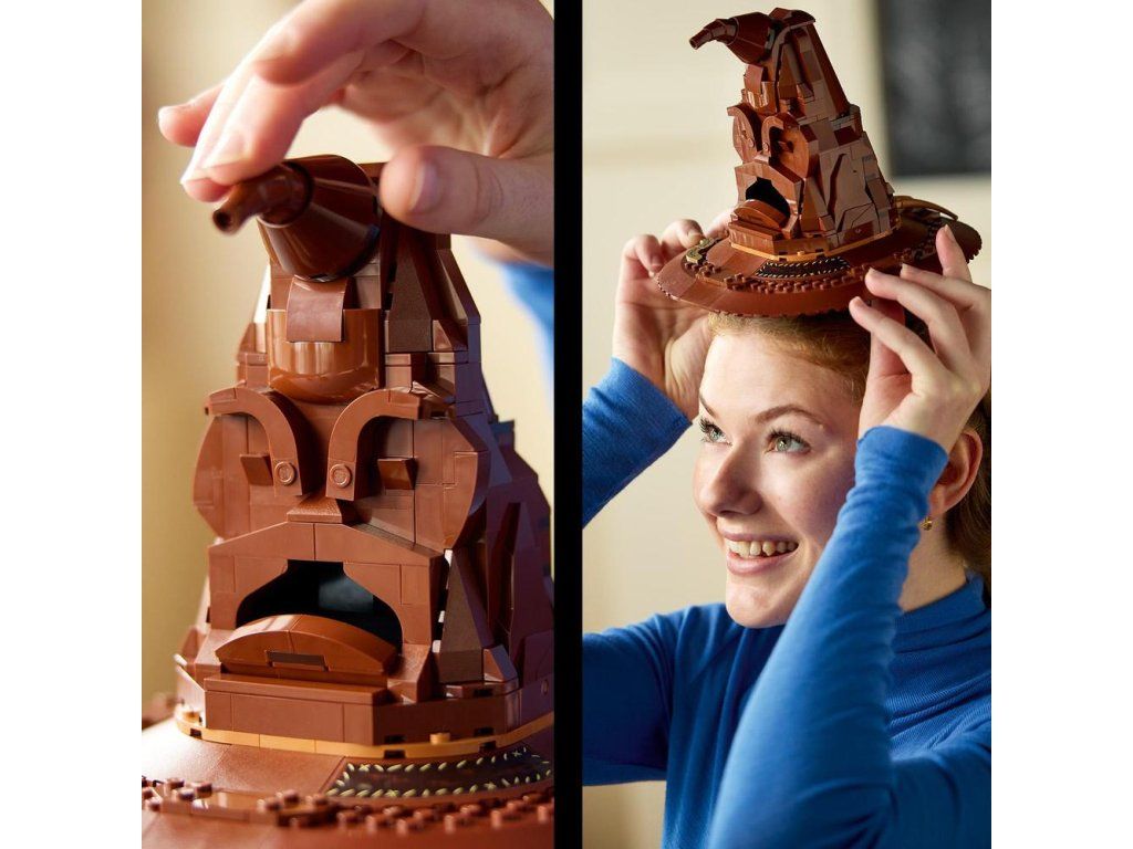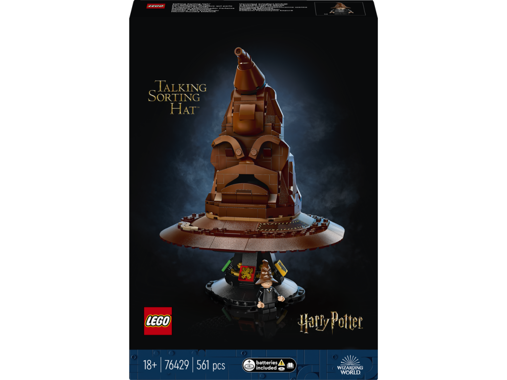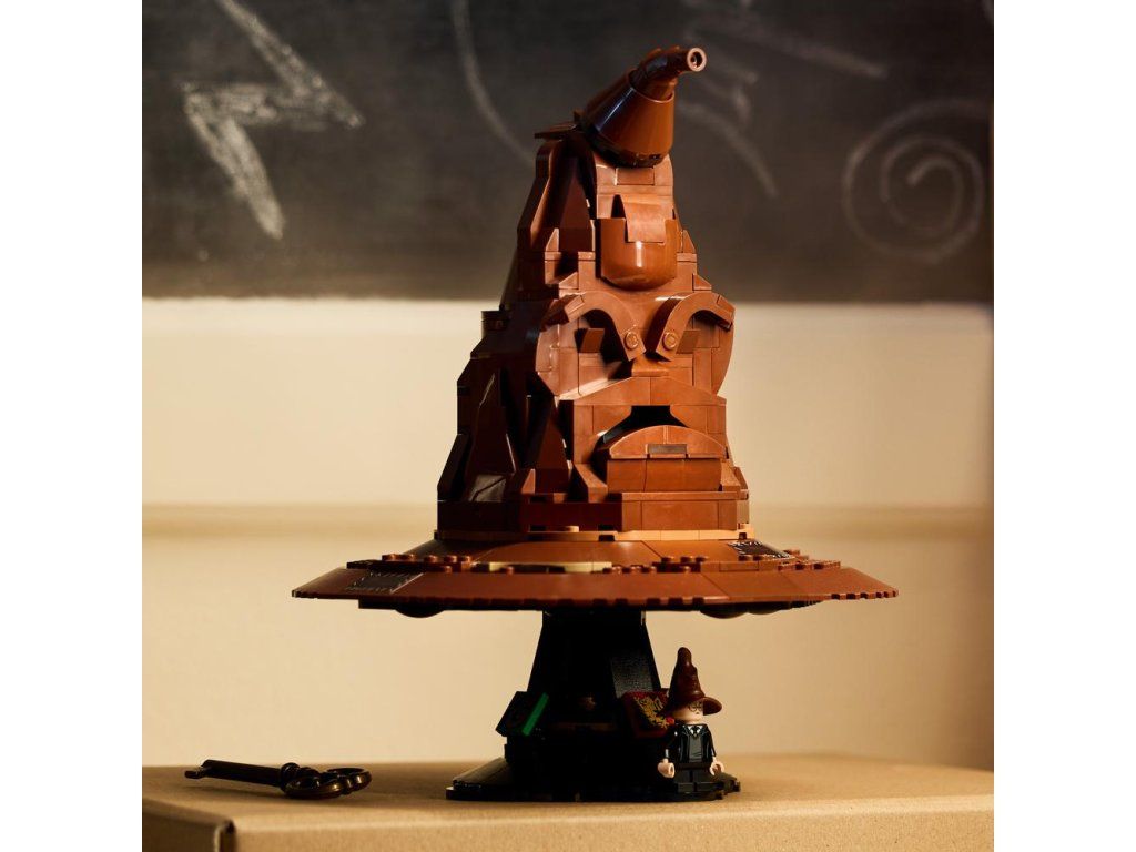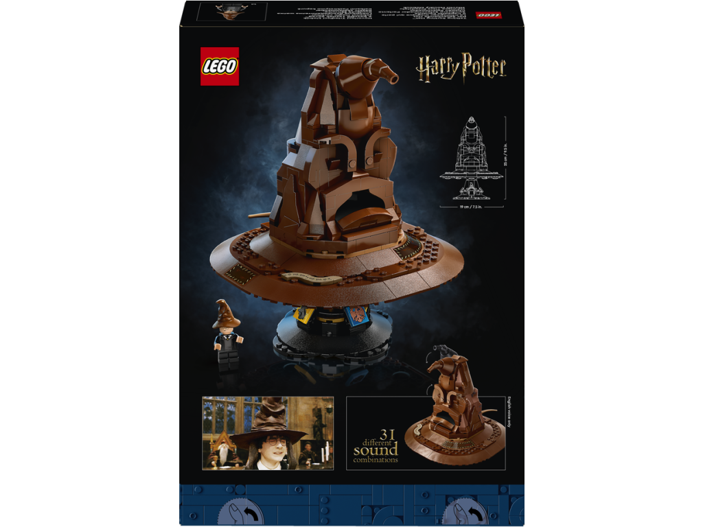 Ponořte se do stavění okouzlujícího modelu Mluvící Moudrý klobouk (76429). Jedná se o zcela první stavebnici z řady LEGO® Harry Potter™ se zvukovou kostkou, která tento model přivádí k životu. Dotkněte se špičky Moudrého klobouku nebo si ho položte na hlavu a aktivujte tak jeho hlas. Klobouk vám sdělí, do které bradavické koleje patříte. Občas také uslyšíte píseň Mluvícího klobouku.