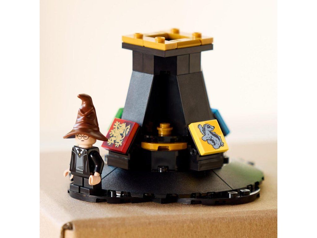 - Podstavec na vystavení s minifigurkou Harryho Pottera – Podstavec na vystavení je zdobený erby Nebelvíru, Zmijozelu, Mrzimoru a Havraspáru a Harry má na hlavě vlastní Moudrý klobouk