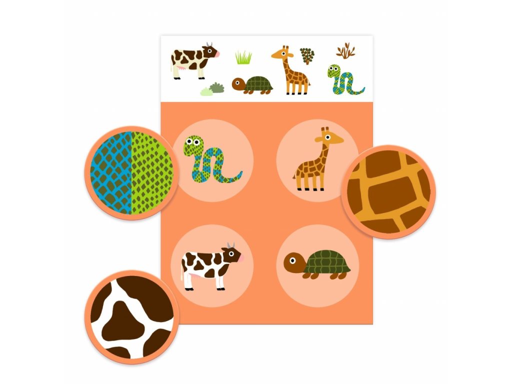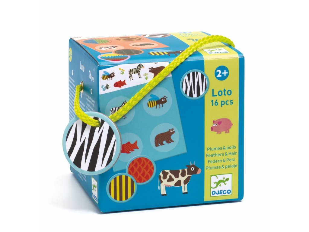 Hra loto v krabičce o zvířatech a jejich srsti, peří a dalších... Skvělá pomůcka pro trénink paměti. Pro děti od 2 let.