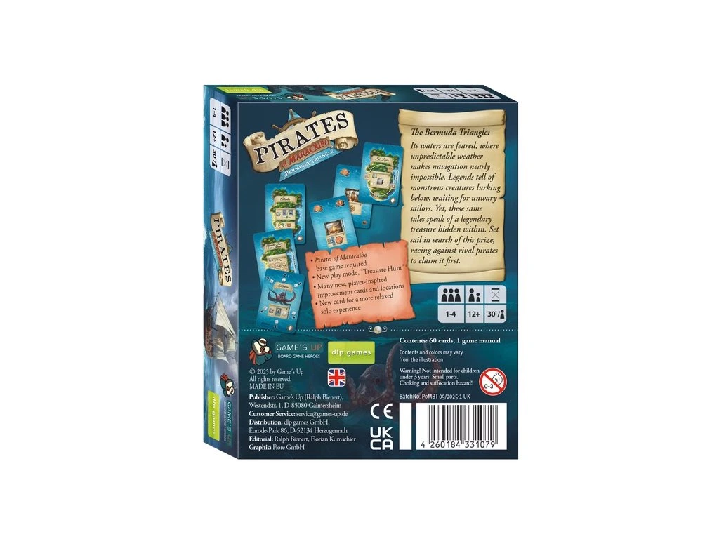 Rozšíření Pirates of Maracaibo: Bermuda Triangle obsahuje modul „Treasure Hunt“, ve kterém soutěžíte proti sobě v závodě o nalezení největšího pokladu. Obsahuje také nové vylepšovací karty, které můžete přidat do základní hry pro větší rozmanitost, a také novou kartu pro sólový režim.