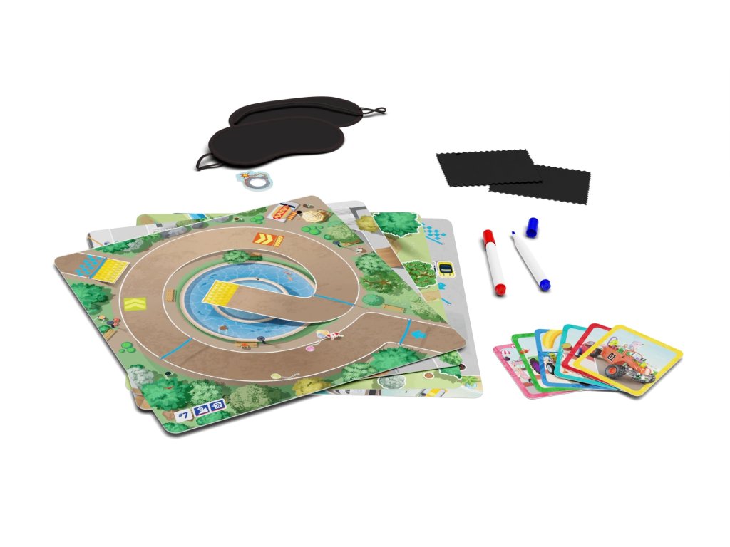 - Každý řidič umístí svůj fix na startovní šipku na své desce tratě a zakryje si oči maskou. Neměl by nic vidět. Nepodvádějte! Jeden z kopilotů se chopí pilotova palce druhé ruky, kterým bude pohybovat jako „joystickem“.