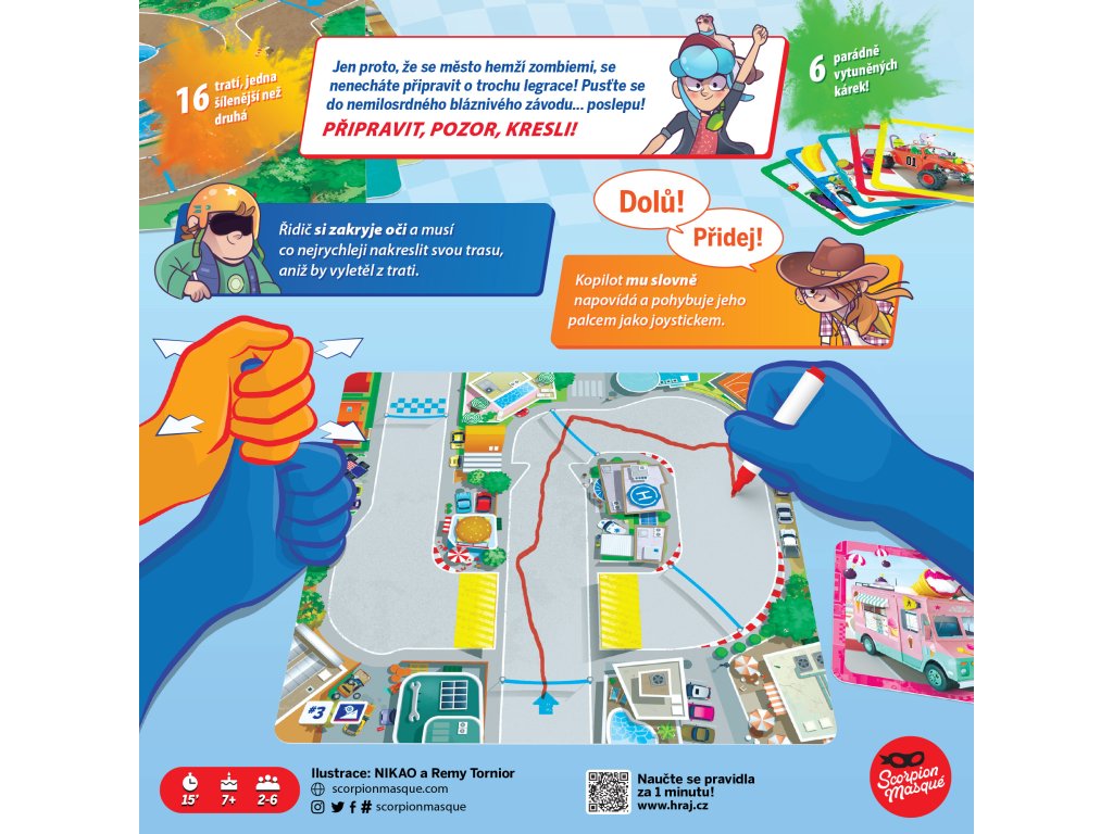 - Vytvořte 2 týmy po 2 až 3 hráčích. Týmy mohou být různě početné. V každém týmu zvolte prvního řidiče a dejte mu fix a masku. Ostatní hráči představují kopiloty (role se budou v průběhu hry střídat).