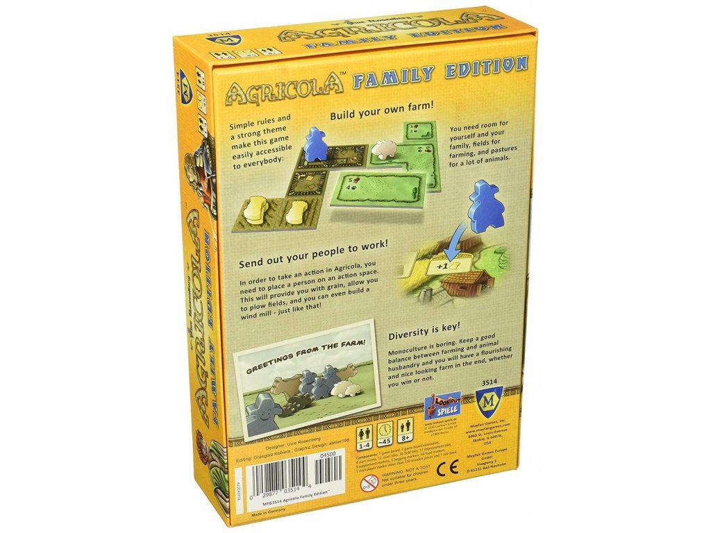 Agricola: Family Edition je výrazně zjednodušená verze populární strategické hry z farmářského prostředí. Hráči představují sedláky v 17. století a mají za úkol přežít. Musí tak zasít obilí, sklidit, upéci třeba chleba, postavit třeba zeď. Důležité je taky vylepšovat dům, aby se do něj vešla celá rodina.