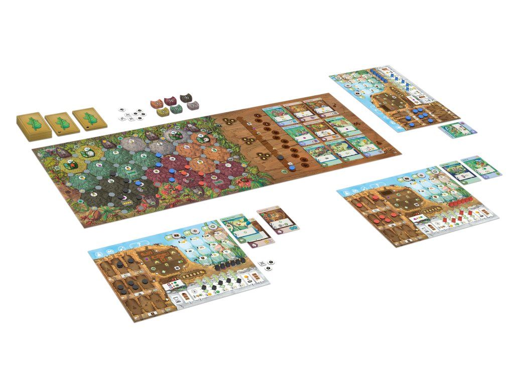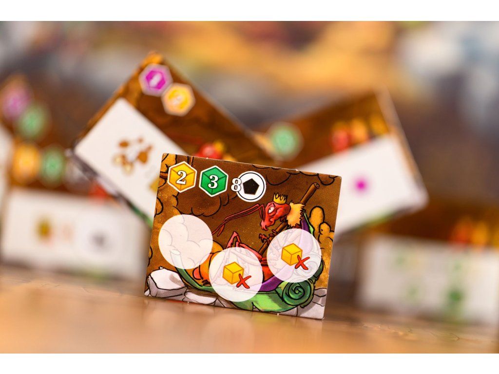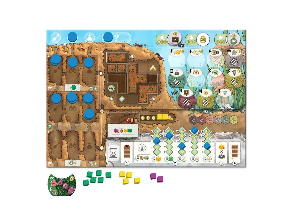 Jádrem hry je správa životního cyklu kolonie. Na své destičce vývoje sleduješ tři stádia — vajíčka, larvy a mravence — a v každém z nich tři specializace: kopáči, průzkumníci a sběrači. Divocí mravenci fungují jako univerzální jednotky, které mohou zastoupit jakoukoli specializaci.