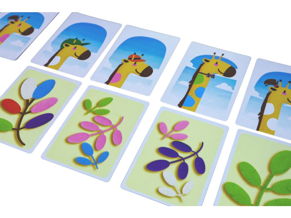 Na každé kartě je hlava žirafy s 1, 2 nebo 3 skvrnami na krku, které představují, co žirafa jí. Na rubu těchto karet jsou 1, 2 nebo 3 listy různých barev. Hráči se snaží popadnout kartu s hlavou žirafy v naději, že do konce kola najdou potřebné listy pro její potravu. Pokud se žirafa nají, její krk se prodlouží. Na konci hry vyhrává žirafa s nejdelším krkem!