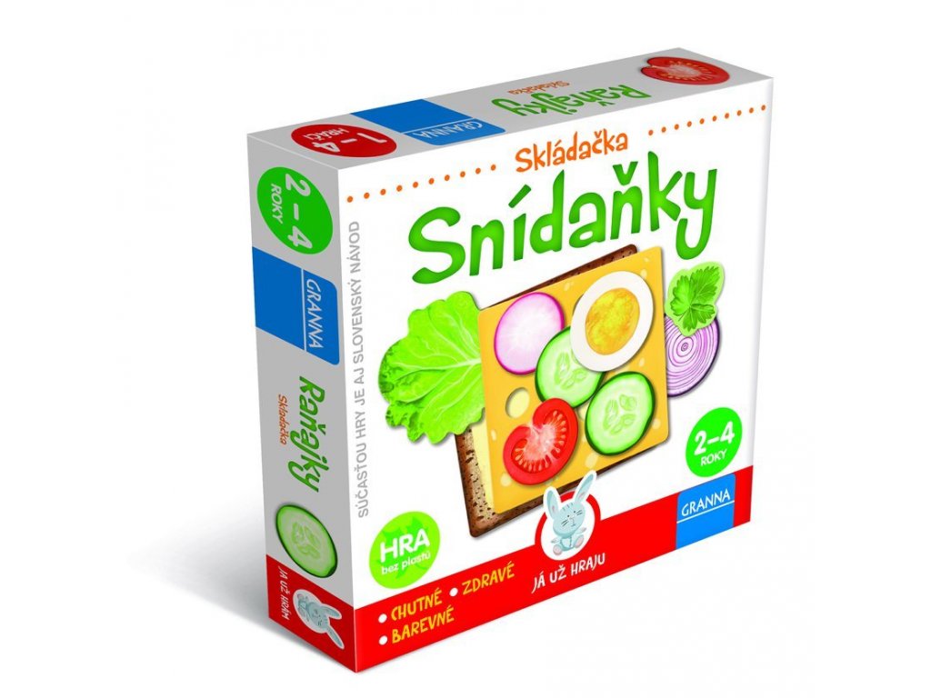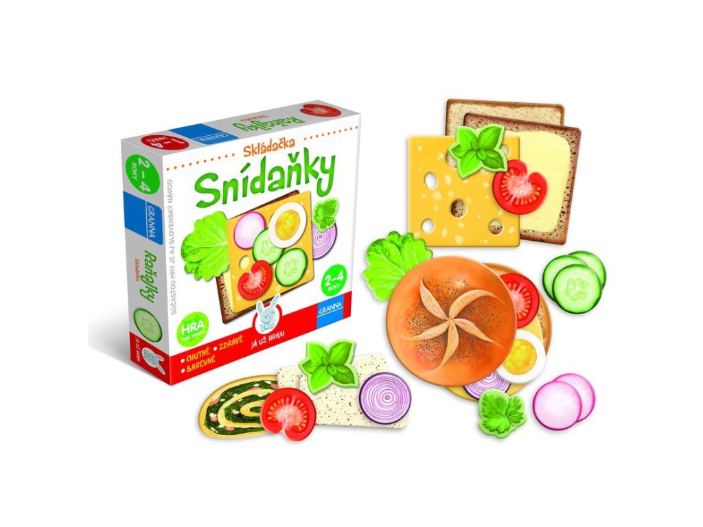 Je čas připravit tvůj první chlebíček. Rozlož si na stůl všechny součásti hry tak, aby byly dobře vidět. Zeptej se rodičů, jak se jednotlivé potraviny jmenují. Najdi si své oblíbené pečivo a vyber si 5 různých doplňků. Vytvoř chutný chlebíček a naservíruj ho na talířku, který najdeš na dně krabičky.