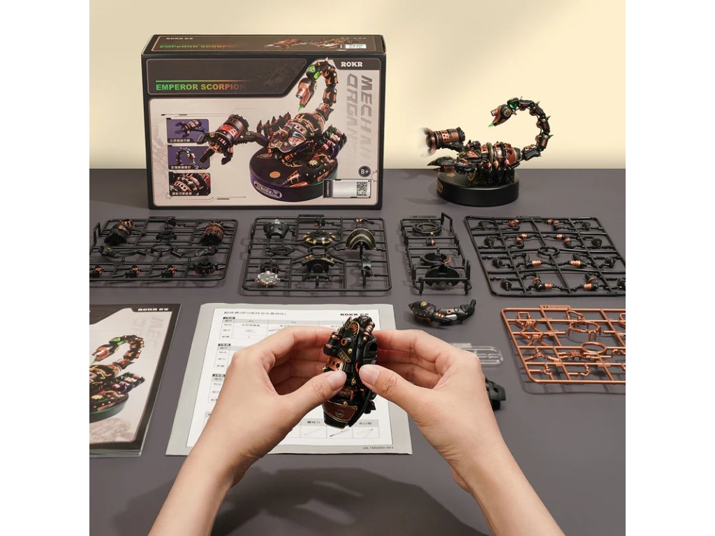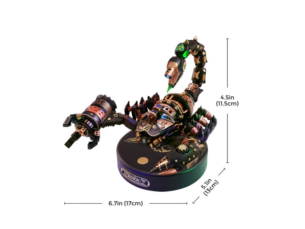 Jakmile je vypuštěný, Císař Scorpion je nepřekonatelný. Jeho vysoce mechanizovaná transformace způsobí, že se vaši nepřátelé budou třást strachem. Jeho pravá klešť se vyvinula do třídrápového uchopovacího ramene se silným jádrem, které mu umožňuje využívat různé režimy rotace k roztrhání nepřátel. Jeho tyčící se ocas je vybavený ostrými hroty a září modrým světlem, což umožňuje bodat s úžasnou přesností, zatímco zelené světlo označuje smrtící neurotoxiny ocasu, které mohou zabít s jedním zásahem. Nechte se pohltit tímto fascinujícím projektem, který potěší jak vaši mysl, tak vaše ruce. Sestavte svého vlastního císaře Scorpiona a poznejte adrenalin, který přináší bitva. Nekompromisní, kreativní a vysoce originální – RoboTime 3D mechanické puzzle modelu Císař Scorpion bude okrasou vašeho obývacího pokoje, nebo jako dárek pro všechny dospívající a dospělé nadšence fascinující hmyzí říše a robotických modelů. Vyrobeno z bezpečného, netoxického a ekologicky šetrného materiálu.