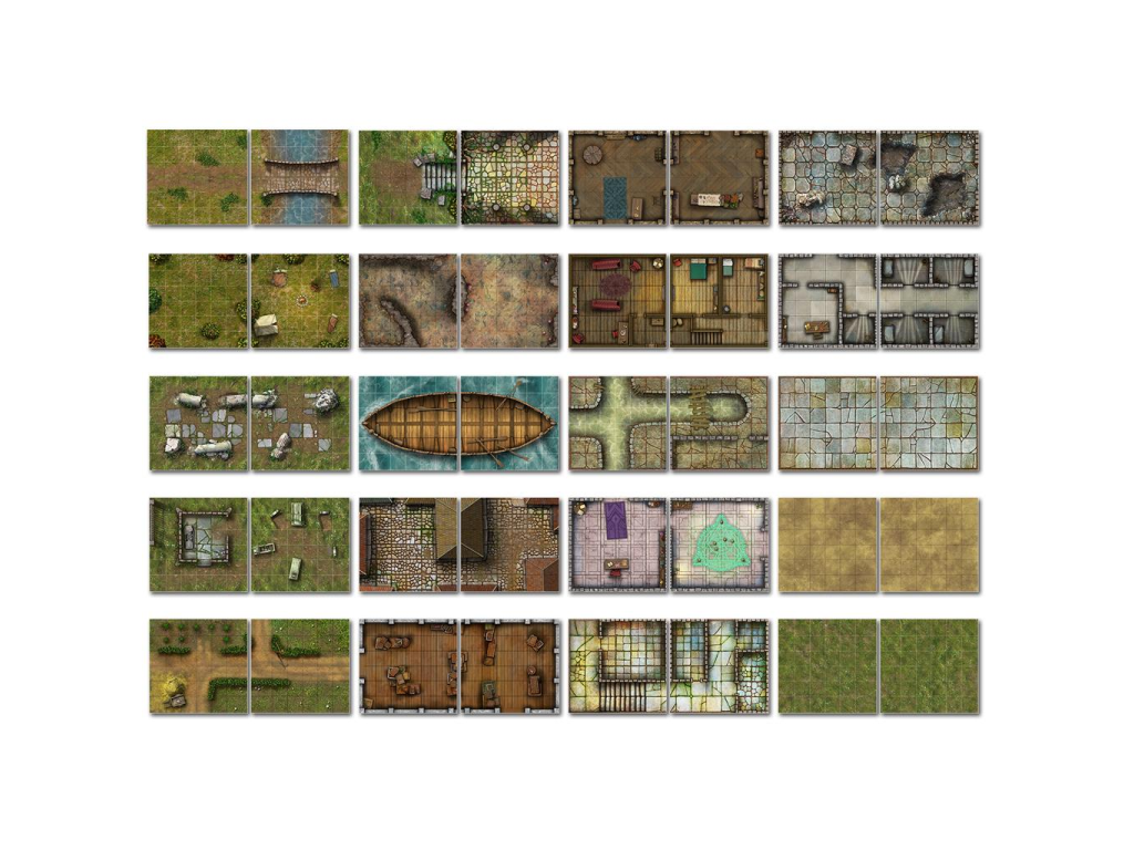 Sada Giant Book Of Battle Mats Volume 2 obsahuje 62 mapových dílů o rozměru A3 pro znázornění boje ve hrách na hrdiny (RPG). Mapy jsou spojeny kroužkovou vazbou, každá je rozdělena mřížkou (čtverec o straně 1", tj. 2,54 cm).Mapy nabízí rozličná herní prostředí pro vaše dobrodružství a jsou laminovány, což umožňuje suché i mokré mazání popisovače.